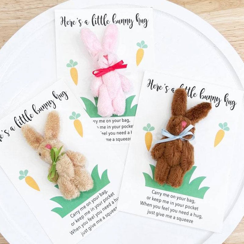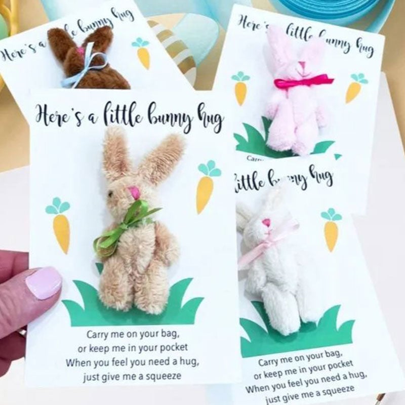 Each bunny comes with a heartfelt card that reads, "Here's a little bunny hug. Carry me on your bag, or keep me in your pocket. When you feel you need a hug, just give me a squeeze." It’s the perfect way to share love with friends, family, or even as a self-care treat for yourself.