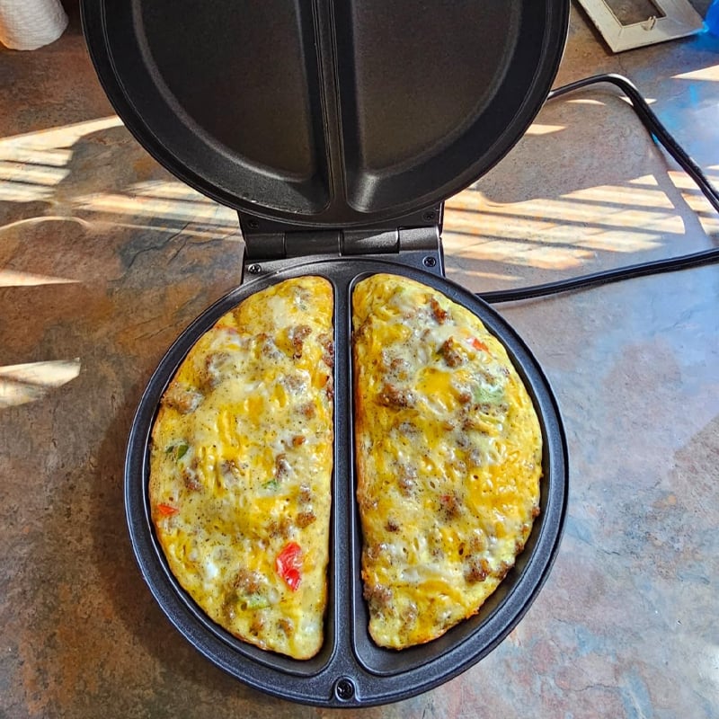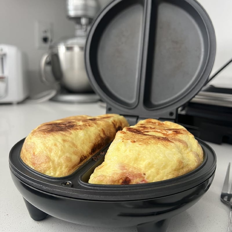 "I’m the world’s worst flipper. Every omelet I tried to make in a pan ended up as scrambled eggs. This thing is a lifesaver. Just pour it in, close it, and 3 minutes later it slides right out.