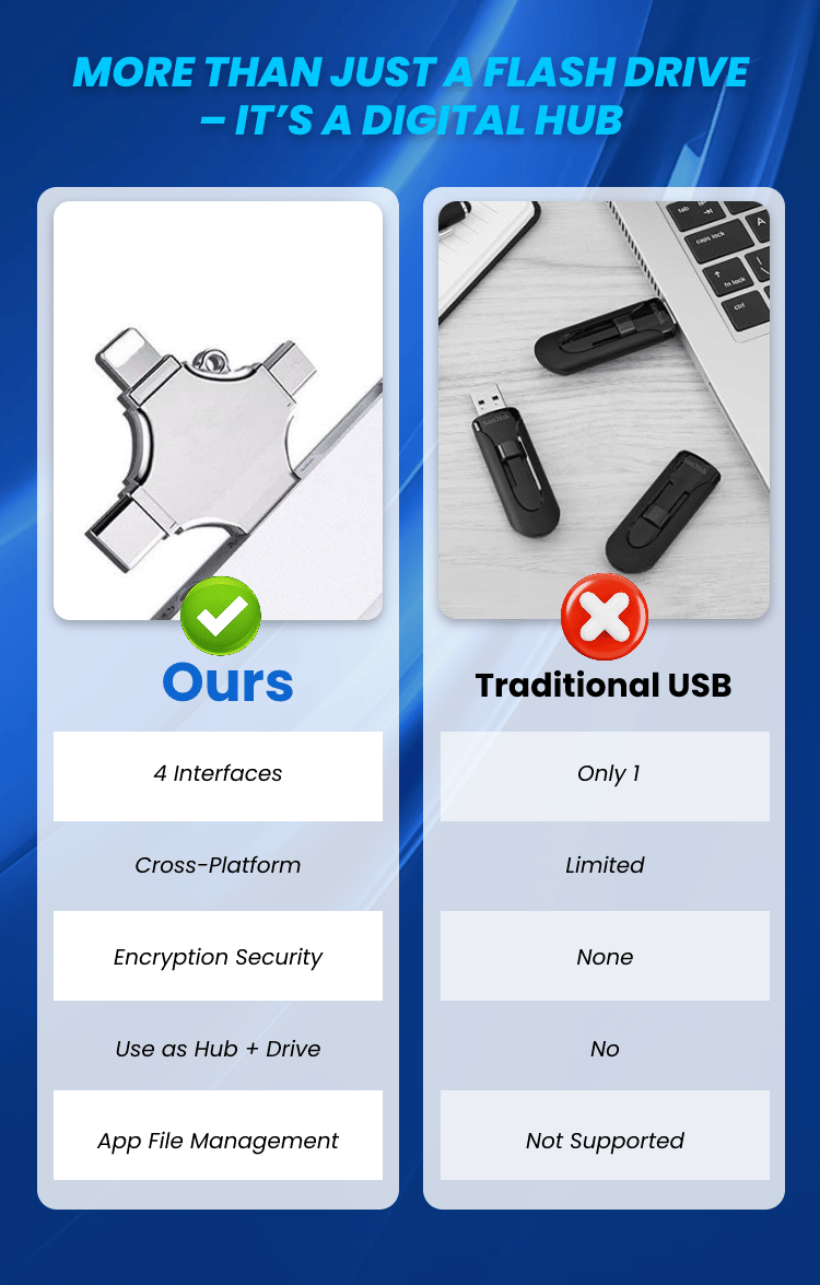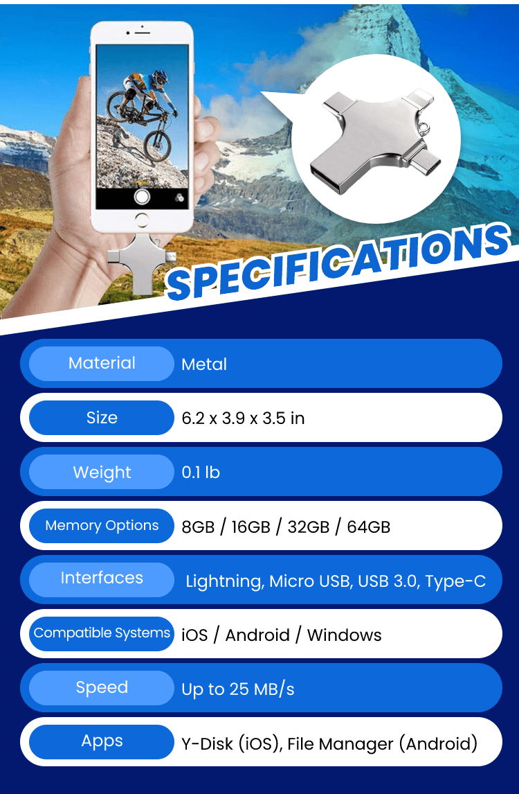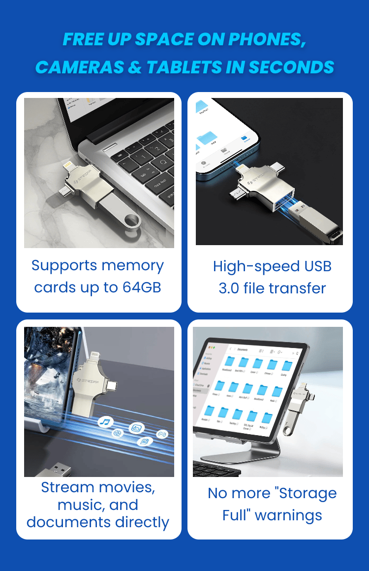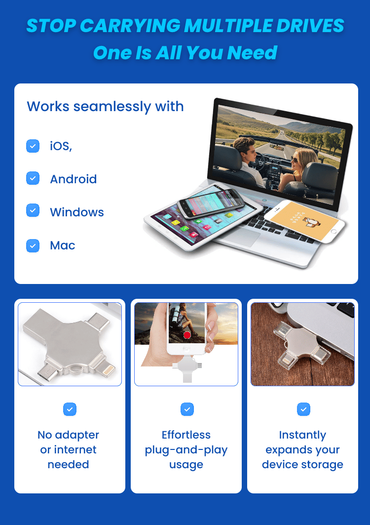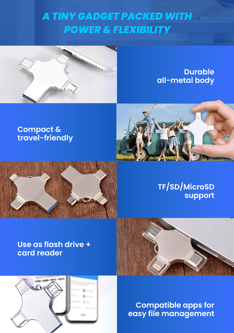 I move files between my iPhone, Android, and laptop all the time. This 4-in-1 design is a lifesaver—no need for adapters, and the transfer speed is really fast!